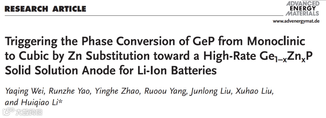 Yaqing Wei, Runzhe Yao, Yinghe Zha, Ruoou Yang, Junlong Liu, Xuhao Liu, Huiqiao Li*. Triggering the Phase Conversion of GeP from Monoclinic to Cubic by Zn Substitution toward a High-Rate Ge1-xZnxP Solid Solution Anode for Li-Ion Batteries. Adv. Energy Mater. 2022, DOI: 10.1002/aenm.202202884.