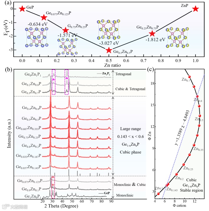 图3. 不同Zn固溶比例下系列Ge1−xZnxP固溶体的计算形成能(a),XRD图谱(b)及阳离子势(c)。