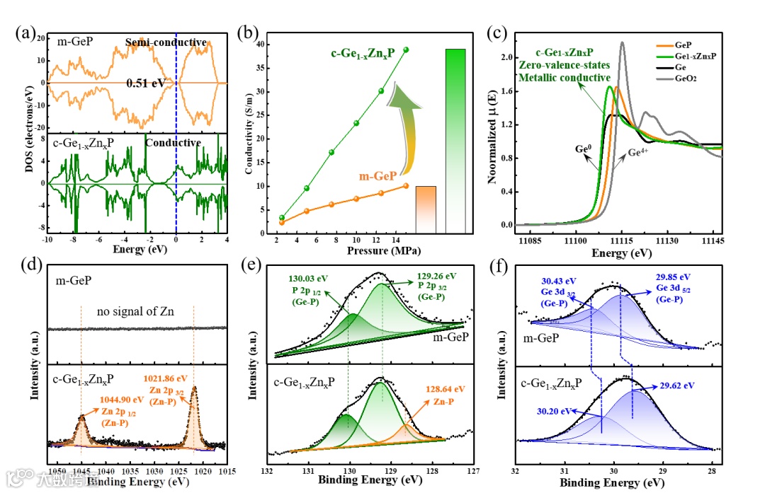 图2. 比较单斜相GeP与立方相Ge1−xZnxP的能带结构/态密度(a),粉末导电性测试(b),同步辐射Ge-K edge硬X射线吸收图谱(c),高分辨XPS光电子能谱Zn 2p(d),P 2p(e)及Ge 3d(f)图谱分析。