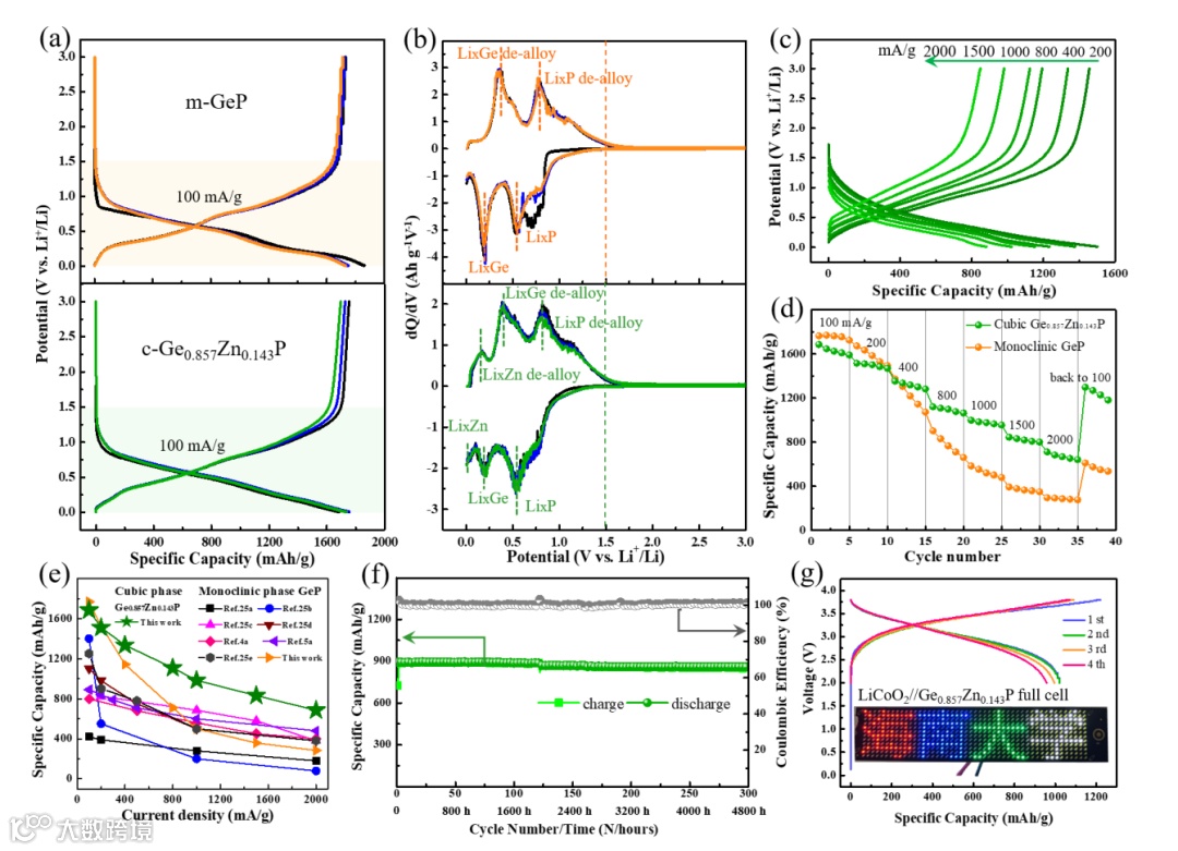 图5. 比较单斜相GeP和立方相Ge1−xZnxP的充放电曲线(a),dQ/dV图谱(b),倍率性能(c-e);Ge1−xZnxP的循环稳定性(f)和在LiCoO2//Ge1−xZnxP全电池(g)中的应用。