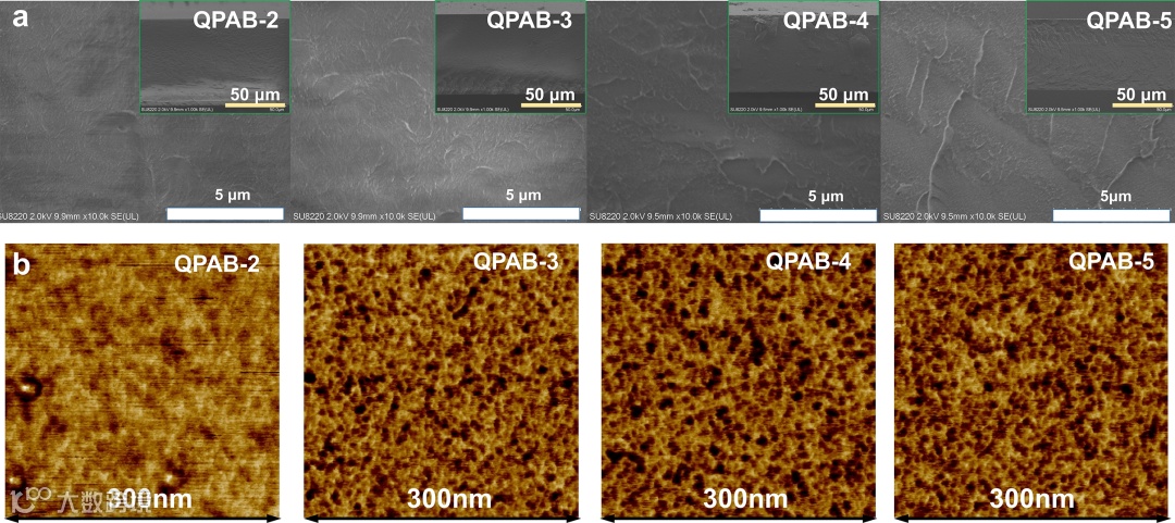 图3. QPAB-x膜的扫描电镜图(a)和原子力显微镜图(b)。