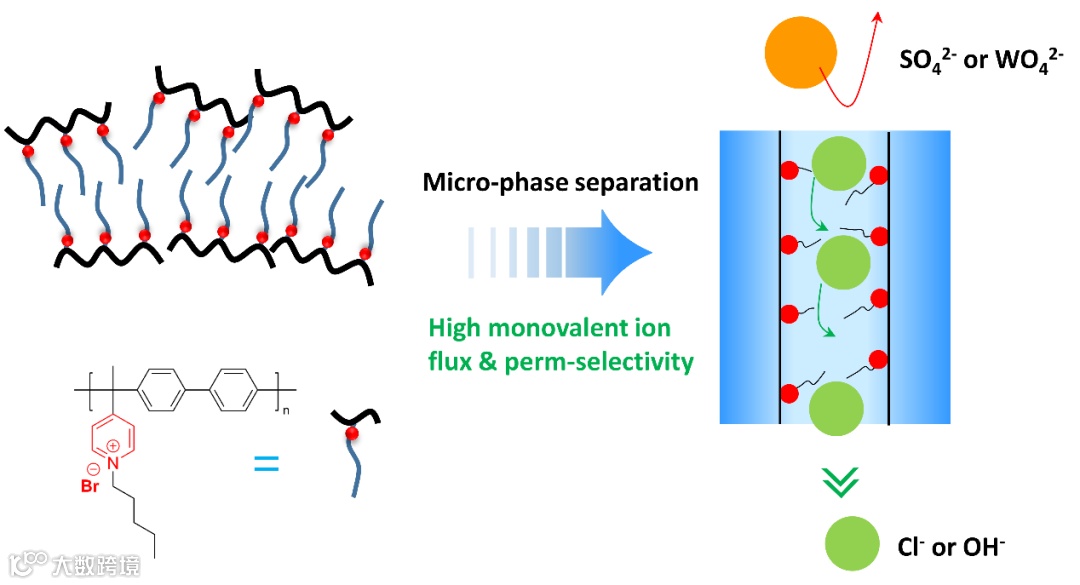 图1. 含疏水侧链的聚(烷基联苯吡啶)基阴离子膜用于一/二价阴离子分离示意图。