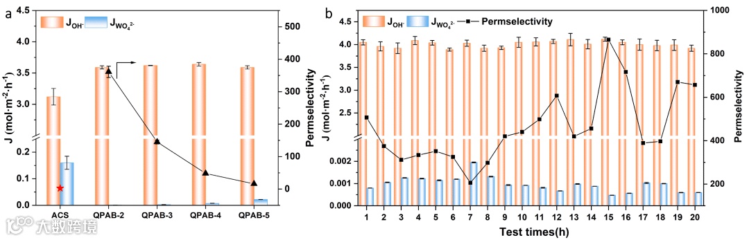 图8. QPAB-x膜和ACS膜的OH-/WO42-分离性能(a)和QPAB-2膜的循环稳定性(b)。
