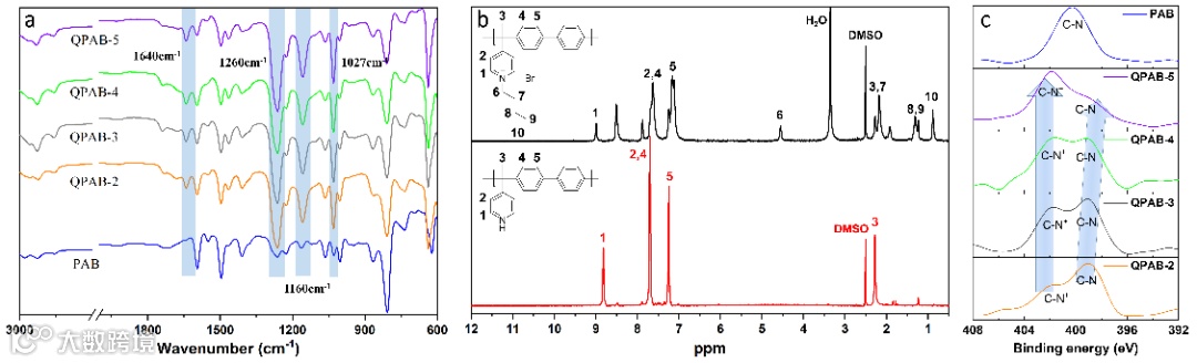 作者首先通过ATR-FTIR和1H NMR验证了聚(烷基联苯吡啶)(PAB)和季铵化聚(烷基联苯吡啶)(QPAB-x)的成功合成。并通过XPS谱图中C-N+和C-N峰位面积的变化,进一步证实了随着溴戊烷添加量的增加,其季铵化程度的逐步升高。