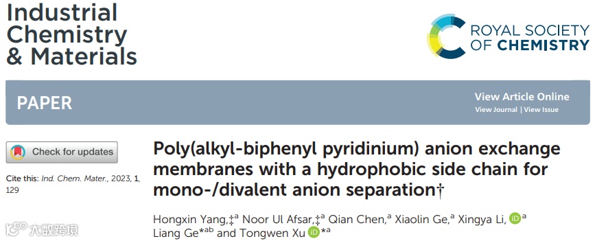 本文中,中国科学技术大学徐铜文教授和葛亮教授课题组在Industrial Chemistry & MaterIals 上发表论文,以聚(烷基联苯吡啶)为聚合物主链,通过引入疏水侧链,诱导主侧链微相分离,实现膜内选择性离子传输通道的构筑。基于一/二价阴离子水合半径以及吉布斯水合自由能的差异,所构筑的阴离子膜在Cl-/SO42-和OH-/WO42-体系中,均表现出较高的一价阴离子通量和一/二价阴离子分离性能。特别是,基于无醚主链结构设计,所构筑出的膜在碱性条件仍表现出优异的一/二价阴离子分离性能和碱稳定性。