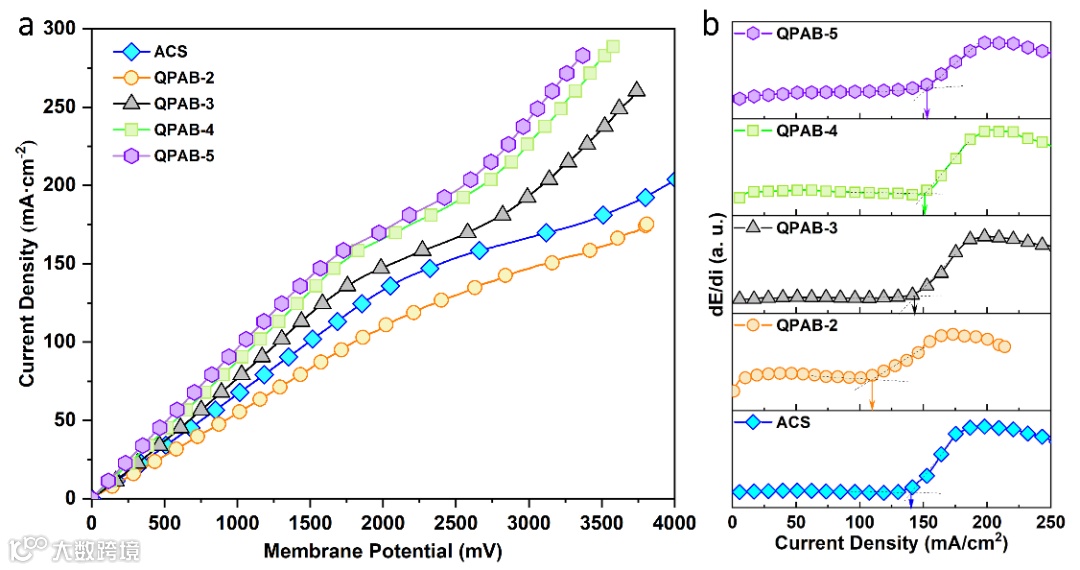 图6.QPAB-x膜和ACS膜的I-V曲线(a)和对应的dE/di与电流密度的曲线图(b)。