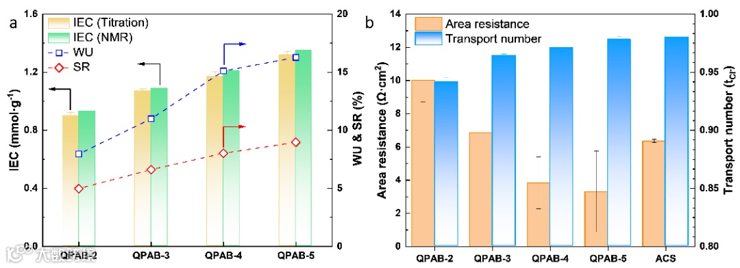 图4. QPAB-x膜的离子交换容量、含水率和溶胀度(a)。QPAB-x膜和ACS膜的膜面电阻和迁移数(b)。