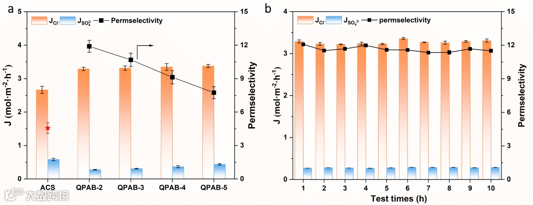 图7.QPAB-x膜和ACS膜的Cl-/SO42-分离性能(a)和QPAB-2膜的循环稳定性(b)。
