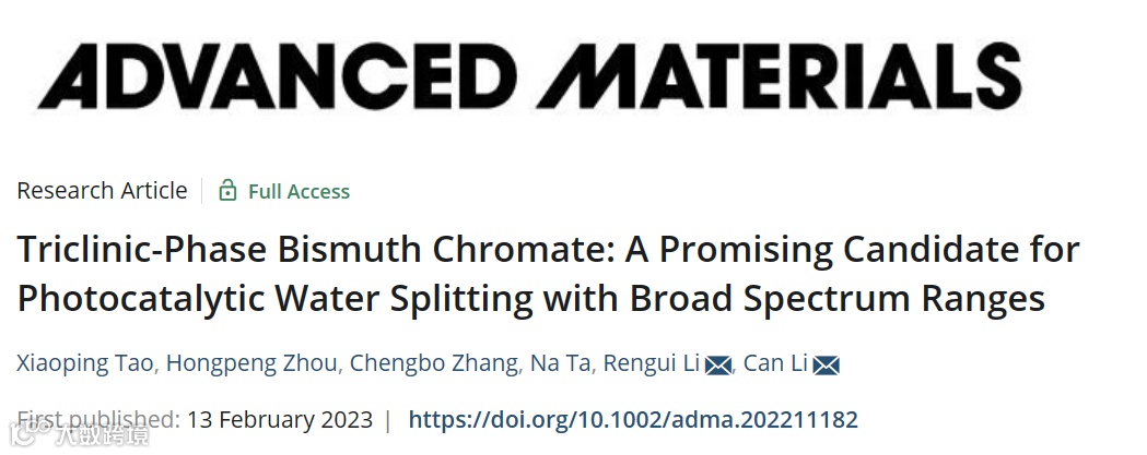 基于此,中科院大连化学物理研究所的李灿院士和李仁贵研究员在《Advanced Materials》期刊上发表了题为“Triclinic-phase bismuth chromate: A promising candidate for photocatalytic water splitting with broad spectrum ranges”的文章(DOI: 10.1002/adma.202211182),报道了一种吸光带边大于650 nm的具有全新三斜相晶体结构的铬酸铋半导体材料的开发及其光催化水分解研究。该研究结果不仅拓展了新的光催化材料体系,同时也为从材料晶体结构调控入手,理性设计合成新型稳定宽光谱响应光催化材料提供了新的思路。