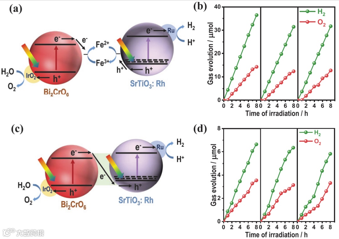 图5. IrO2/Bi2CrO6和Ru/SrTiO3:Rh构建Z体系示意图及水分解活性-时间曲线。(a-b) Fe3+/Fe2+体系;(c-d) 纯水体系。