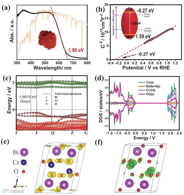 图3. 三斜相Bi2CrO6 电子结构表征。(a) 实验和理论模拟吸收光谱;(b) Mott-Schottky测试及能带位置示意图;(c, d) DOS图;(e, f) 价带顶和和导带底电荷在实空间的分布密度。
