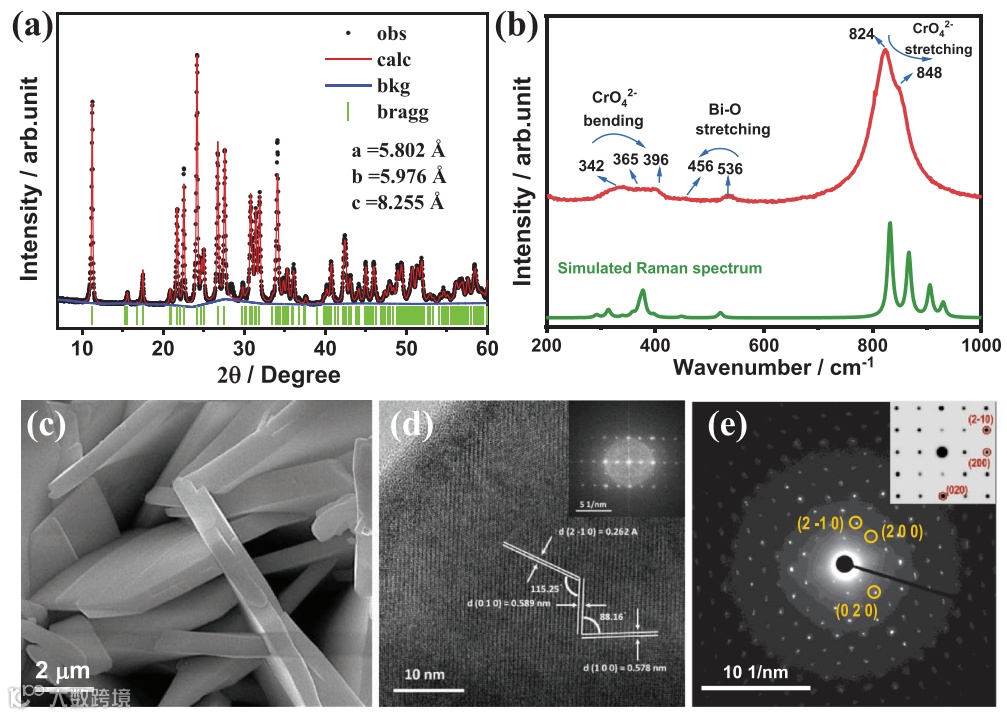 图2. 三斜相Bi2CrO6 晶体结构表征。(a) 粉末XRD衍射精修及X射线单晶模拟衍射峰;(b) 实验及理论模拟拉曼光谱;(c) SEM图;(d) HRTEM及FFT变换图;(e) [001]方向SAED实验及模拟对照图。