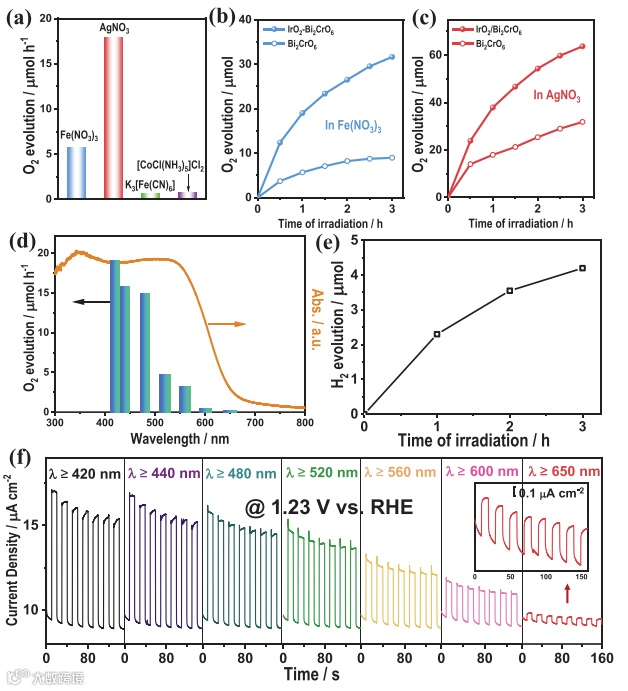 图4. 三斜相Bi2CrO6光催化性能表征。(a-c) 不同电子给体体系光催化产氧活性图;(d) 不同波长下光催化水氧化活性与吸收光谱;(e) 光催化产氢活性-时间曲线;(f) 不同波长下光电流密度-时间曲线。