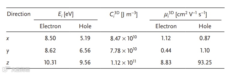 表1. 三斜相Bi2CrO6载流子沿各方向形变电势、有效质量和迁移率理论计算结果。