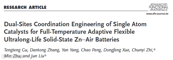 全温自适应柔性超长寿命固态锌空气电池单原子催化剂的双位点配位工程