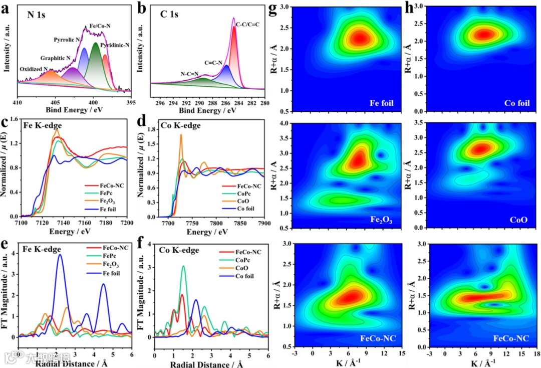 为了进一步了解FeCo-NC催化剂中单个Fe和Co位点的化学状态和局部环境,采用x射线吸收近边结构(XANES)和傅里叶变换扩展x射线吸收精细结构(FT-EXAFS)光谱法进行了研究。如图3c所示,Fe K边XANES曲线显示,Fe3Co7-NC的吸收边位置位于Fe2O3和Fe箔之间,接近FePc,说明Fe的价态在0到+3之间。