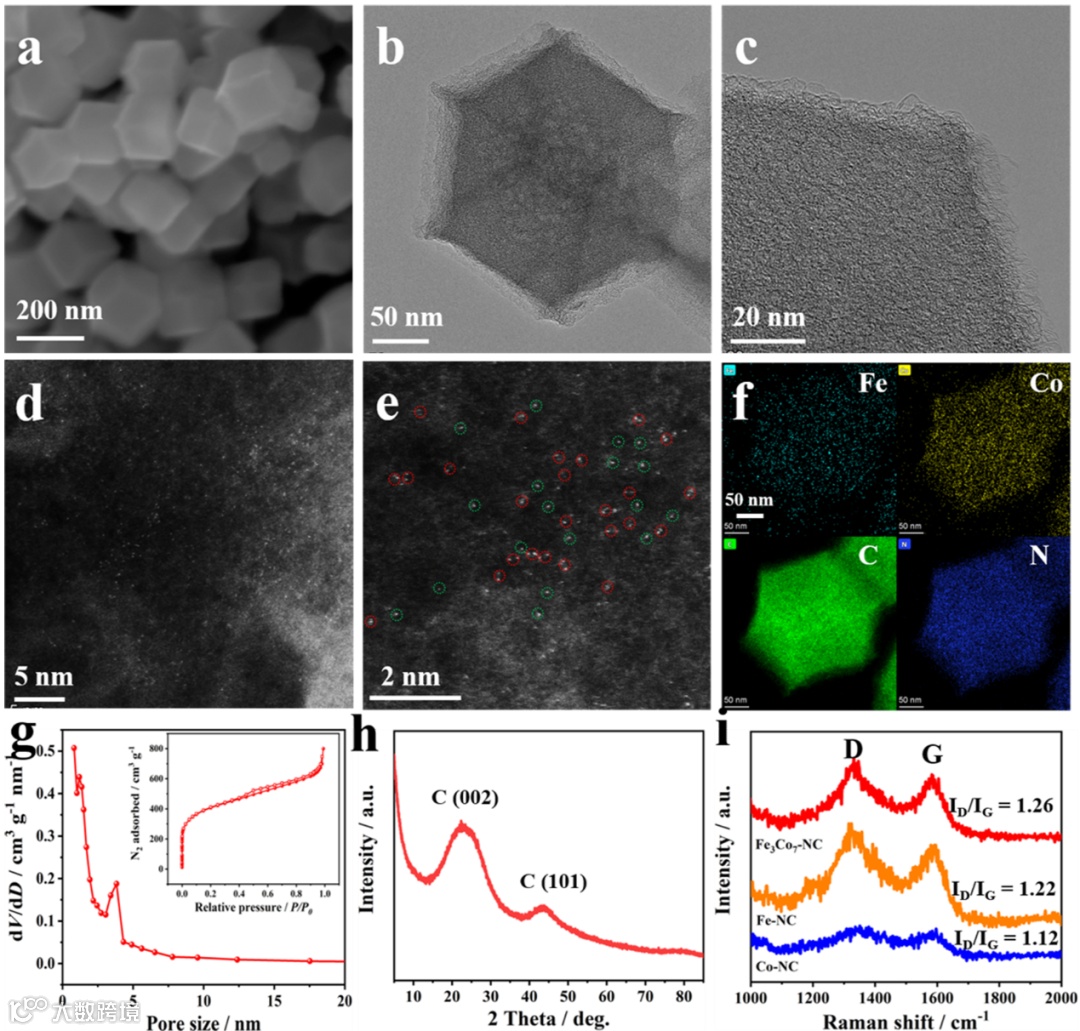 Figure. 2 a) SEM, b) TEM, c) HR-TEM images of Fe3Co7-NC. d, e) HAADF-STEM images of Fe3Co7-NC. f) EDS elemental mapping images. g) Pore-size distributions and inset: N2 adsorption-desorption isotherms of Fe3Co7-NC. h) XRD pattern of Fe3Co7-NC. i) Raman spectra of Fe3Co7-NC, Fe-NC, and Co-NC.