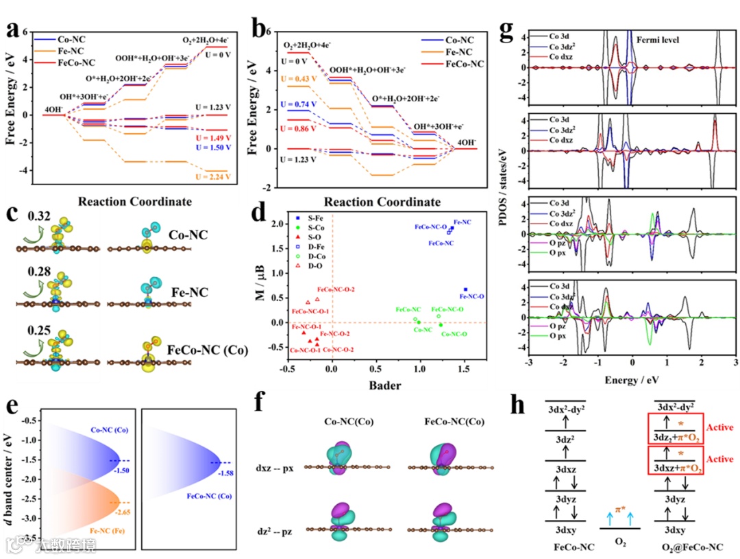 FeCo-NC中Fe原子和Co原子之间存在电荷转移,从而改变了活性Co原子和吸附O2的磁矩方向。Co-NC、Fe-NC和FeCo-NC的d带中心分别位于-1.50、-2.65和-1.58 eV(图4e)。FeCo-NC (Co)相对于Co-NC的d带中心下移,减弱了OO*的过量吸附能,促进了分子解离,有利于OER/ORR反应的持续进行。