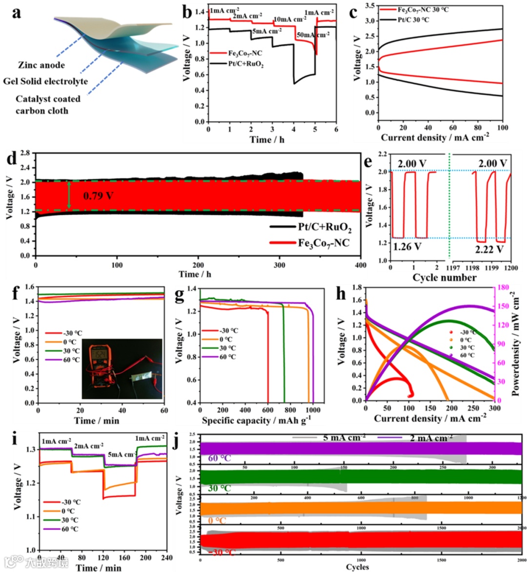 Figure. 5 a) Schematic diagram of the flexible solid-state ZAB configuration. b) Discharging plateaus with current densities from 1 to 50 mA cm-2 of ZAB-Fe3Co7-NC and ZAB-Pt/C+RuO2 at 30 ℃. c) Charge/discharge profiles of ZAB-Fe3Co7-NC and ZAB-Pt/C+RuO2 at 30 ℃. d) Galvanostatic cycling stability at 2 mA cm-2 of ZAB-Fe3Co7-NC and ZAB-Pt/C+RuO2 at 30 ℃. e) Magnified plots of the galvanostatic discharge and charge curves at different cycling stages for ZAB-Fe3Co7-NC at 30 ℃. f) Open-circuit voltages of ZAB-Fe3Co7-NC at different temperatures. g) Discharging capacity plots at a constant current density of 2 mA cm-2 of ZAB-Fe3Co7-NC at different temperatures. h) Discharge and power density plots and i) discharging plateaus with current densities from 1 to 5 mA cm-2 of ZAB-Fe3Co7-NC at different temperatures. j) Cycling tests of the ZAB-Fe3Co7-NC at 2 and 5 mA cm-2 and at different temperatures.