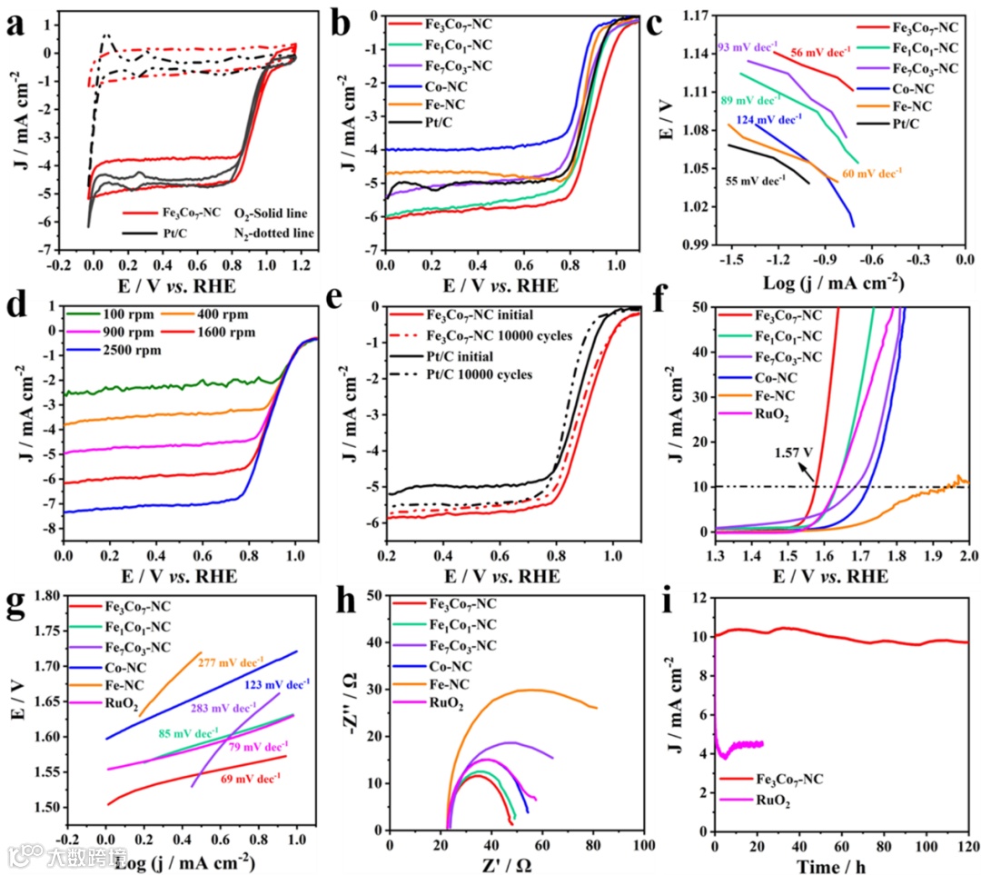 Figure. 4 a) ORR CV curves of Fe3Co7-NC and Pt/C in Ar (dotted line) and O2 (solid line)-saturated 0.1 M KOH at the scan rate of 10 mV s-1. b) ORR polarization curves of Fe3Co7-NC, Fe1Co1-NC, Fe7Co3-NC, Co-NC, Fe-NC, and Pt/C at a rotating rate of 1600 rpm. c) Corresponding Tafel plots derived from the LSV curves. d) ORR polarization curves of Fe3Co7-NC at different rotation rates. e) The ORR polarization curves before and after 10000 cycles of Fe3Co7-NC and Pt/C. f) OER polarization curves of Fe3Co7-NC, Fe1Co1-NC, Fe7Co3-NC, Co-NC, Fe-NC, and RuO2 in 0.1 M KOH. g) Corresponding Tafel plots derived from the LSV curves. h) EIS Nyquist plots, and i) the current-time curve of Fe3Co7-NC and RuO2.