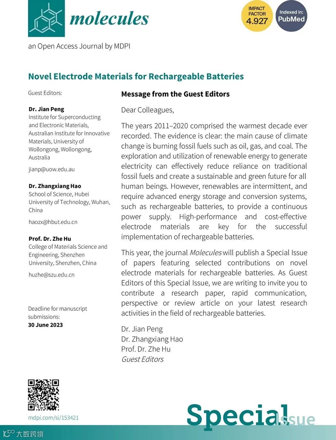为Molecules杂志组织一期特刊,主题为”Novel Electrode Materials for Rechargeable Batteries”,期待大家的投稿与支持。Molecules 2022年影响因子为4.927,JCR 2区(Chemistry, Multidisciplinary) CiteScore 1区(Chemistry, Miscellaneous)。我们有一些免版面费的名额,欢迎大家咨询投稿。