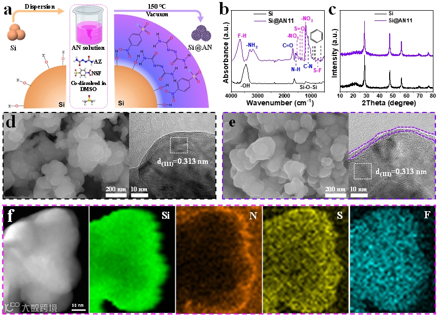 基于上述现象和证据, AN复合物呈现出有趣的分解机制。如图3e所示,分解机制主要分为三个部分:1. NSF分子中-SO2F基团的S-F键断裂,F-与Li+结合形成无机LiF。2.-NO2基团发生明显的电化学反应,N自由基相互反应形成稳定的N=N键,O原子与Li+结合形成无机Li2O盐。3. S自由基与AZ分子的-NH2基团结合形成磺胺基团,最终形成Poly(AN=N)低聚物。因此, Si@AN11负极性能的提升可能是由于与无机Li2O/LiF盐与Poly(AN=N)低聚物复合的稳定结构SEI膜。