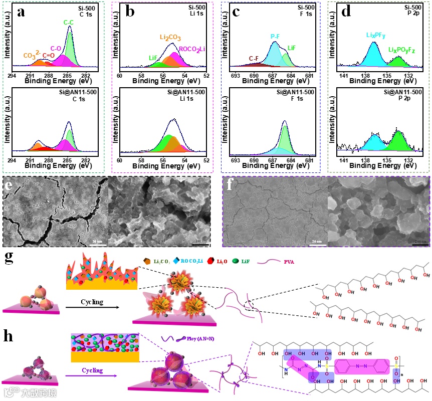 基于XPS和SEM结果,图5g和h显示了Si和Si中的形态演变、界面组成和粘合剂构象的示意图Si@AN11电极在循环期间。对于纯Si电极(图4g),Si颗粒破碎,由于电解质的过度消耗导致形成厚且不规则的SEI层。这种不规则的SEI层具有高电阻特性和不均匀的Li+传输路径,导致活性Si的损失和死Li的积累。