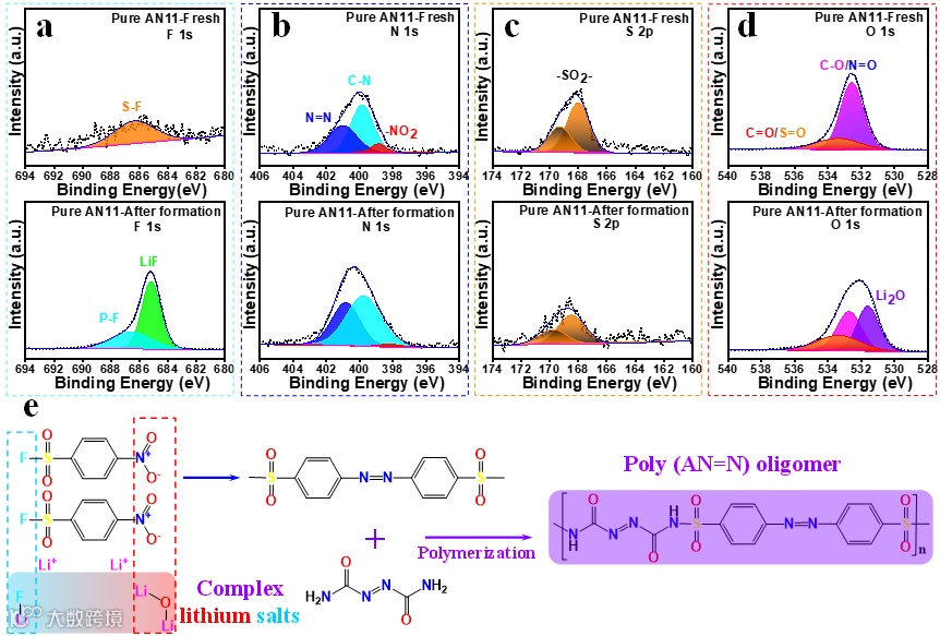 为了进一步研究Si表面上AN11复合层的分解机制,测试分析了新鲜和化成后的AN11电极的XPS谱。在F 1s谱中,新鲜的AN11电极在686.5 eV处具有S-F键,在化成后随着P-F(686.8 eV)和LiF(685.2 eV)成分的出现而消失。因此,可以得出结论,NSF分子也有助于LiF成分的形成。在N 1s谱中,新鲜的AN11电极在401.2、399.7和398.9eV处具有三个峰,分别对应于N=N、C-N和-NO2基团。在S 2p谱中,可以看出循环前后-SO2-基团(S 2p1/2:169.4 eV;S 2p3/2:167.8 eV)稳定存在,这表明了-SO2-基团在充电/放电过程中是电化学惰性的。
