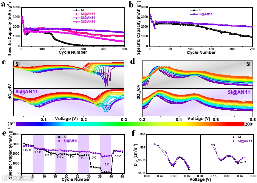 首先,为了优化AN复合层的组成比,首先比较了具有不同AZ和NSF重量比的Si负极在0.5 C充放电时的循环行为,可以发现Si@AN负极的循环性能均优于纯Si负极。Si@AN11负极在第500次循环时保持最高容量(1407.9mAh g-1),与300次循环后几乎没有容量的Si电极形成鲜明对比。这表明了在Si表面上构建AN11复合层的策略可提高Li-Si合金化/去合金化动力学的可逆性。图2e比较了Si和Si@AN11负极的倍率性能。在10 C时,Si阳极几乎没有保留容量,而Si@AN11负极可发挥出1773.5 mAh g-1的容量。这种倍率性能的提升主要是由于AN电化学转化形成的SEI膜具有良好的导锂性。