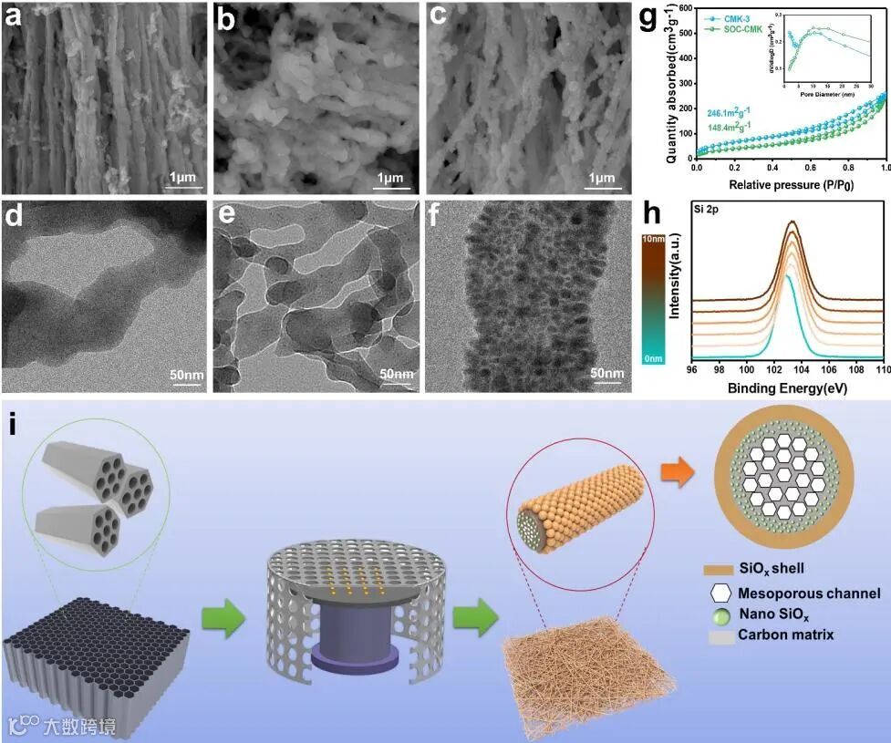形貌显示随着温度升高CMK-3逐渐通过内部介孔通道分散,增强了复合材料结构的松散程度。结合上述分析,在CMK-3上活化屏等离子体沉积SiOx的过程可以通过图2i显示。以SOC-CMK为例,CMK-3在高能等离子体(400°C)轰击下,SiOx被溅射并被沉积进入CMK-3的孔隙中,孔隙被填满后SiOx继续在表面均匀沉积,形成SOC-CMK。这种结构由内部的CMK-3介孔通道、中间被超细纳米SiOx填充的多孔结构和表面的SiOx外壳组成。此外,复合结构还拥有等离子刻蚀形成的氧空位等缺陷。