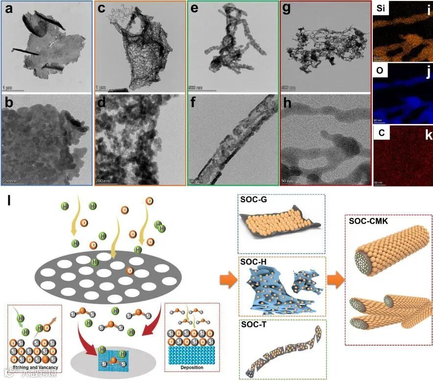 Figure 1. the TEM morphology data of SOC-T (a-b), SOC-G (c-d), SOC-H (e-f) and SOC-CMK (g-h), and corresponding elemental mappings of Si, O, and C (i-k); (l) schematic illustration of the preparation process on different carbon.