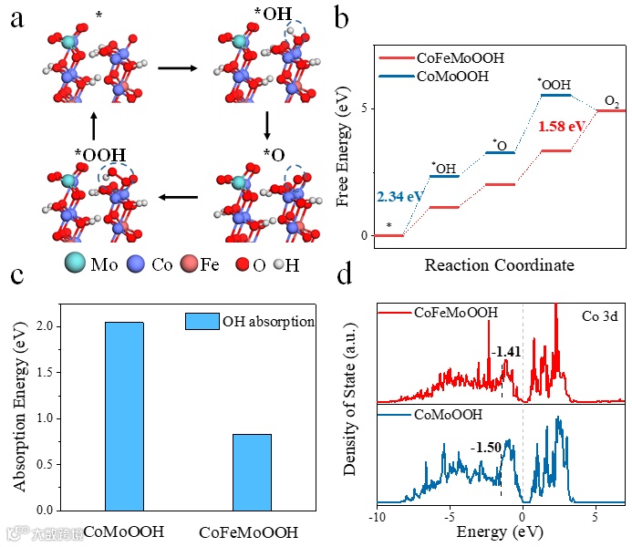 图6. (a) CoFeMoOOH的OER反应路径图。(b) OER自由能图。(c) CoFeMoOOH和CoMoOOH的OH吸附能。(d) Co的部分态密度(PDOS)。