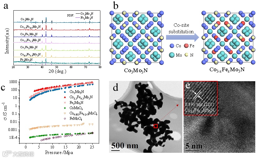 通过水热-氮化的方法合成不同取代程度的氮化物Co3-xFexMo3N。通过XRD和TEM图像证实了材料的成功合成,并与对应氧化物进行导电性的对照测试,验证了Co3-xFexMo3N的优异导电性。