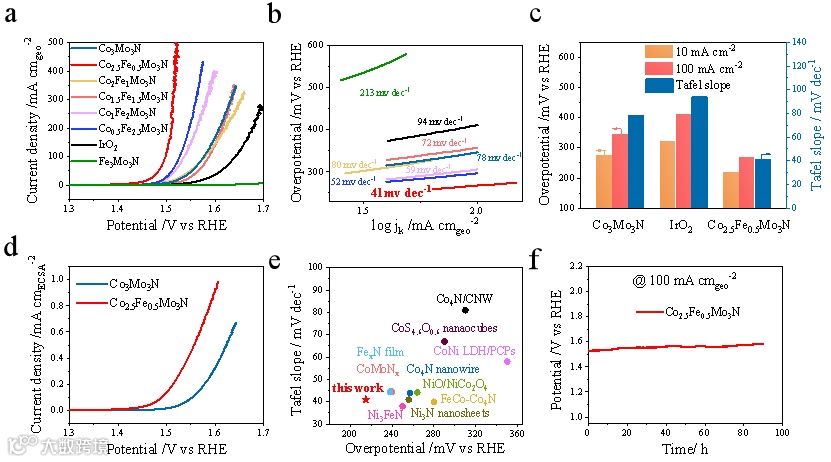图3. (a)Co3-xFexMo3N和IrO2在1 M KOH中的OER极化曲线。(b) Tafel斜率。(c)10、100 mA cm−2下的过电势以及Tafel斜率。(d) ECSA归一化的比活性极化曲线。(e) 不同催化剂在10 mA cm−2下的过电势以及Tafel斜率比较。(f) Co2.5Fe0.5Mo3N 在100 mA cm−2恒定电流密度下的计时电位曲线。