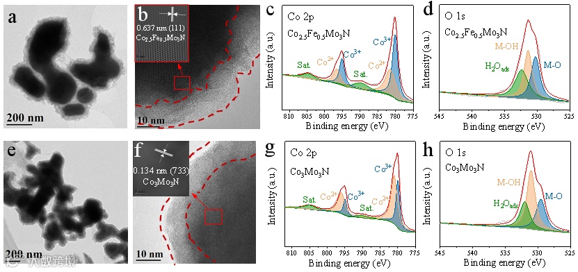 图5. (a-b) Co2.5Fe0.5Mo3N OER反应以后的TEM图像。(c-d)对应的Co 2p 和O 1sXPS谱图。(e-d) Co3Mo3N OER反应以后的TEM图像。(g-h)对应的Co 2p 和O 1sXPS谱图