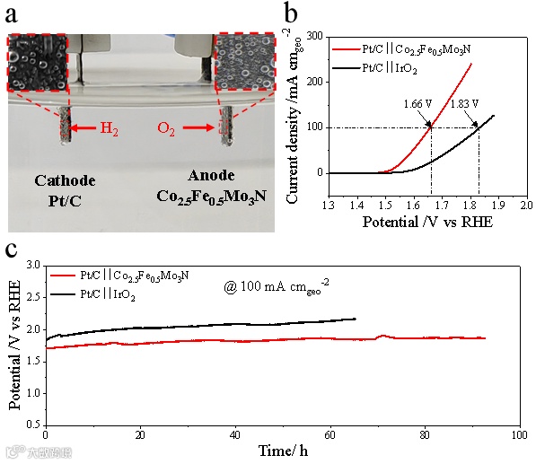 图4. (a)Pt/C || Co2.5Fe0.5Mo3N 电解池示意图。(b) 全解水极化曲线。(c) 电解池的计时电位曲线。