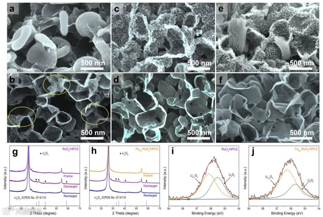图5. a-f) 原始HPCS、RuO2/HPCS和FeSA-RuO2/HPCS正极在放电和充电后的SEM图;g,h) RuO2/HPCS和FeSA-RuO2/HPCS正极在原始、放电和充电阶段的XRD谱图;i,j) RuO2/HPCS和FeSA-RuO2/HPCS正极放电后的Li 1s XPS光谱。