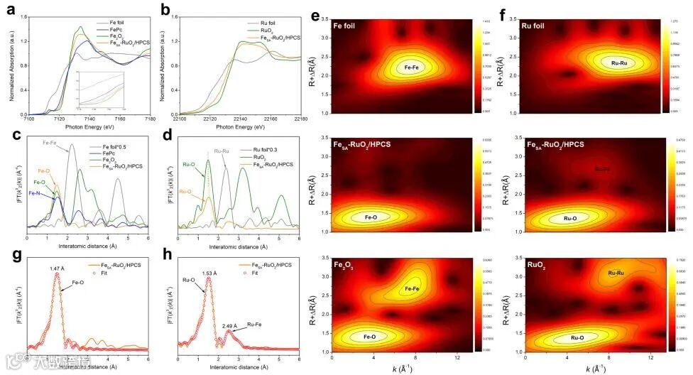 图3. a-c) FeSA-RuO2/HPCS样品的a) Fe的k-边边缘归一化XANES谱;b) Ru-k边缘归一化XANES谱;c) Fe和d) Ru的k边缘的k2-加权EXAFS谱;e) Fe和f) Ru的k边缘的k2加权EXAFS信号的WT模式;在g) Fe R空间和h) Ru R空间对应的EXAFS拟合曲线。