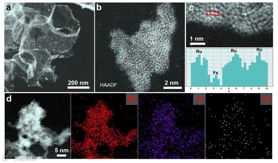 图2. a-c) FeSA-RuO2/HPCS样品在不同放大倍数下的HAADS-STEM图像。d) FeSA-RuO2/HPCS样品的HAADF-STEM图像和相应的EDX元素映射图。