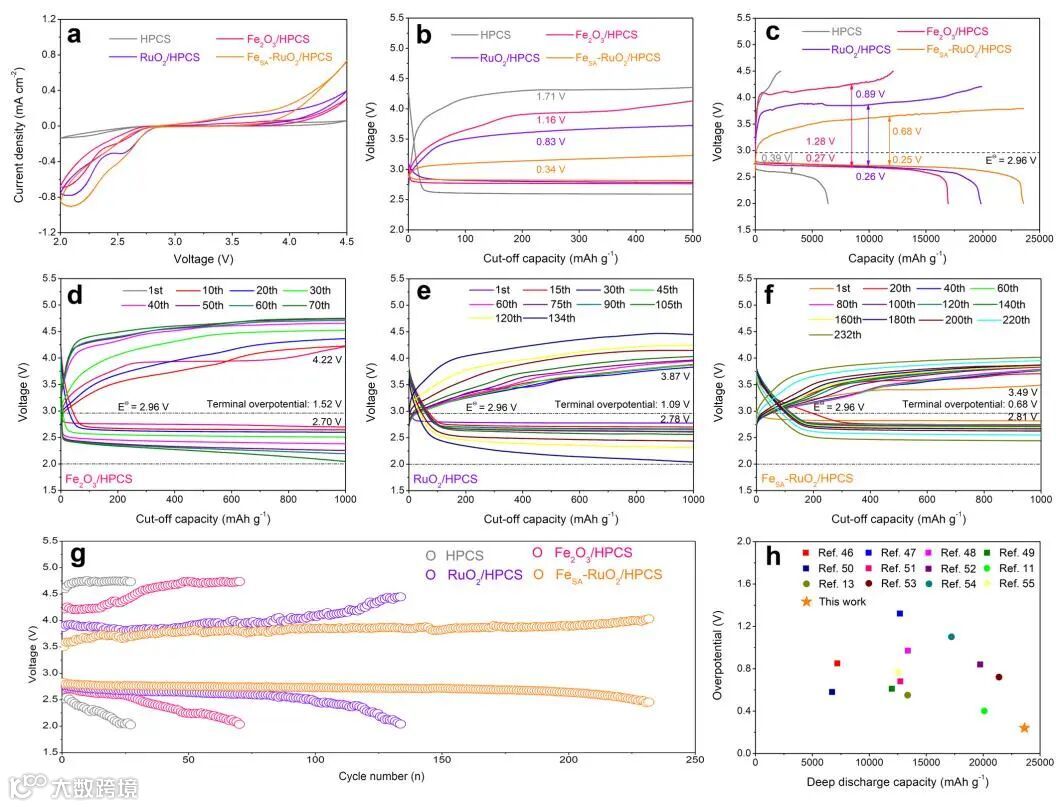 图4. 基于不同正极的Li-O2电池的电化学性能。a-c) 电压窗口为2.0-4.5 V、扫描速率为0.1 mV s-1时的CV曲线;b) 在截至容量500 mAh g-1和电流密度100 mA g-1条件下的首圈过电位;c) 在200 mA g-1电流密度下的深度放电-充电容量;d-f) Fe2O3/HPCS、RuO2/HPCS和FeSA-RuO2/HPCS正极在200 mA g-1和1000 mAh g-1条件下的循环曲线;g) 不同正极在循环过程中的终端电位;h) FeSA-RuO2/HPCS正极的中端过电位和深度放电容量与之前报道的单原子基和钌基正极催化剂的比较。