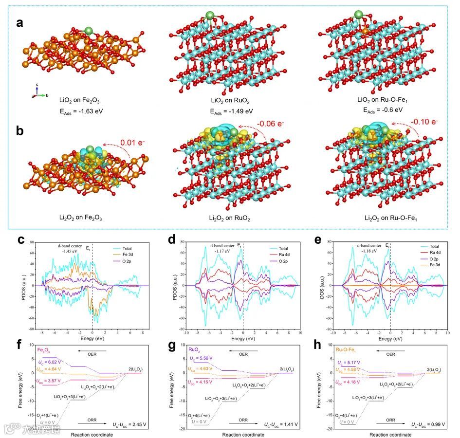 图6. a) 反应中间体LiO2在不同模型上的吸附能;b) 放电产物Li2O2与不同模型之间的电荷转移趋势;c-e) Fe2O3、RuO2和FeSA-RuO2的总态密度和部分态密度;f-h) Li-O2电池的放电-充电过程在Fe2O3、RuO2和Ru-O-Fe1模型上的吉布斯自由能。