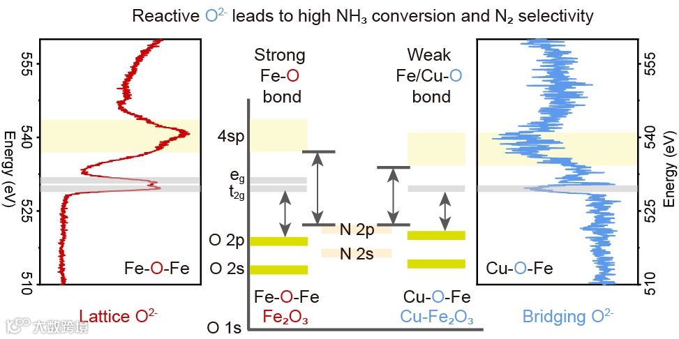 在此,王峰教授团队和郭宇铮教授团队在原子Cu-O-Fe上设计了桥接O2-,以平衡NO形成和N-N耦合的速率,从而实现高NH3转化率和N2选择性。原子Cu位点在573 K时明显促进了Fe2O3的N2产率,弱的Cu-O-Fe键是通过原位Δ近边X射线吸收精细结构(NEXAFS)和密度泛函理论(DFT)计算确定。