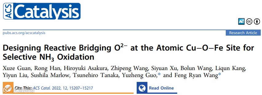 基于此,来自伦敦大学学院的王峰教授与武汉大学的郭宇铮教授合作,在国际知名期刊ACS catalysis上发表题为“Designing Reactive Bridging O2– at the Atomic Cu–O–Fe Site for Selective NH3 Oxidation”的研究论文。通过设计活性Cu-O-Fe桥接O2-物种来促进NH3的催化氧化。这种桥接O2-具有较低的反键轨道能量,因此Cu-O/Fe-O强度较弱。在选择性NH3氧化中,弱的Cu-O/Fe-O键促进NH3转化为NO,并通过Cu-O-NO直接吸附NO,促进N-N耦合以生成N2。