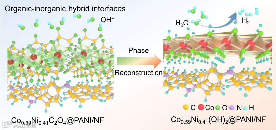 该论文以在碱性环境下的HER过程中具有相重建的特性的草酸盐(CoC2O4)作为无机材料的研究模型,通过电沉积法构建了由聚苯胺(PANI)和草酸盐组成的有机-无机混合结构。草酸盐在碱性条件下的HER过程中形成了真正的活性相氢氧化物。由于PANI和金属位点之间具有强π-d电子耦合,在草酸盐相变过程中,PANI层可以有效保持结构稳定。PANI和活性相之间的π-d电子耦合被继承下来,以促进电子结构优化和金属位点的本征活性增强。