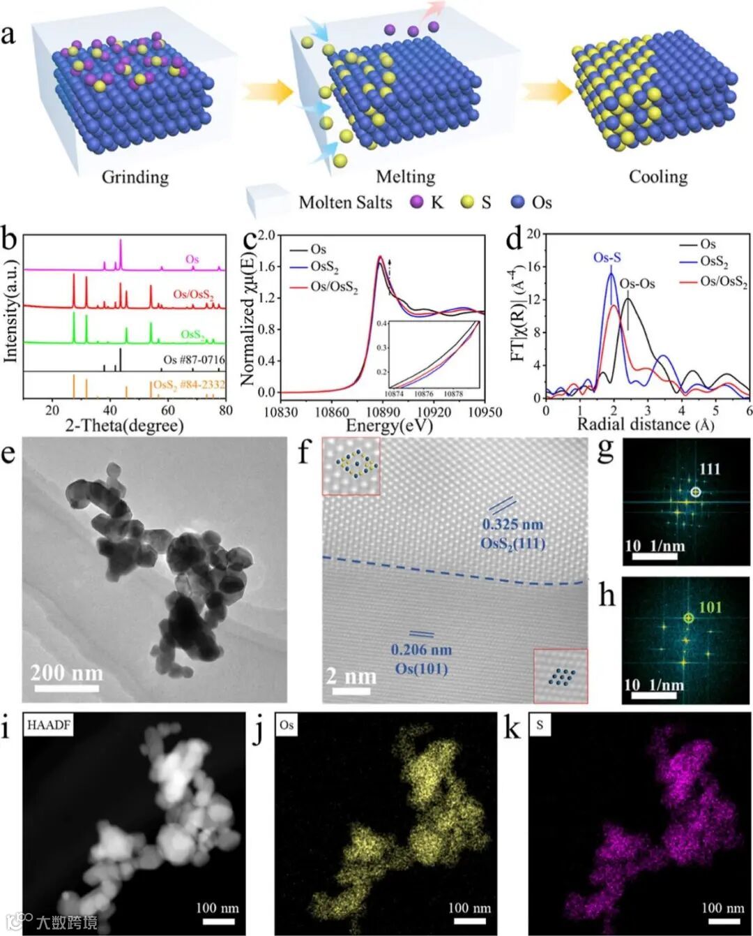 图2. Os/OsS2异质界面的合成与物性表征结果。