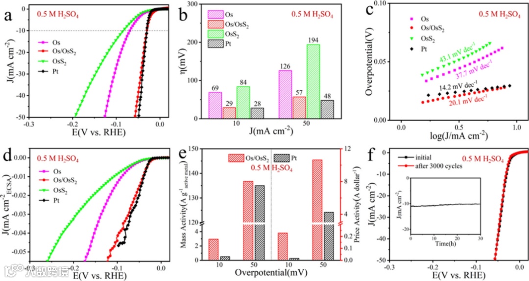 图3. Os/OsS2异质界面的酸性HER性能。