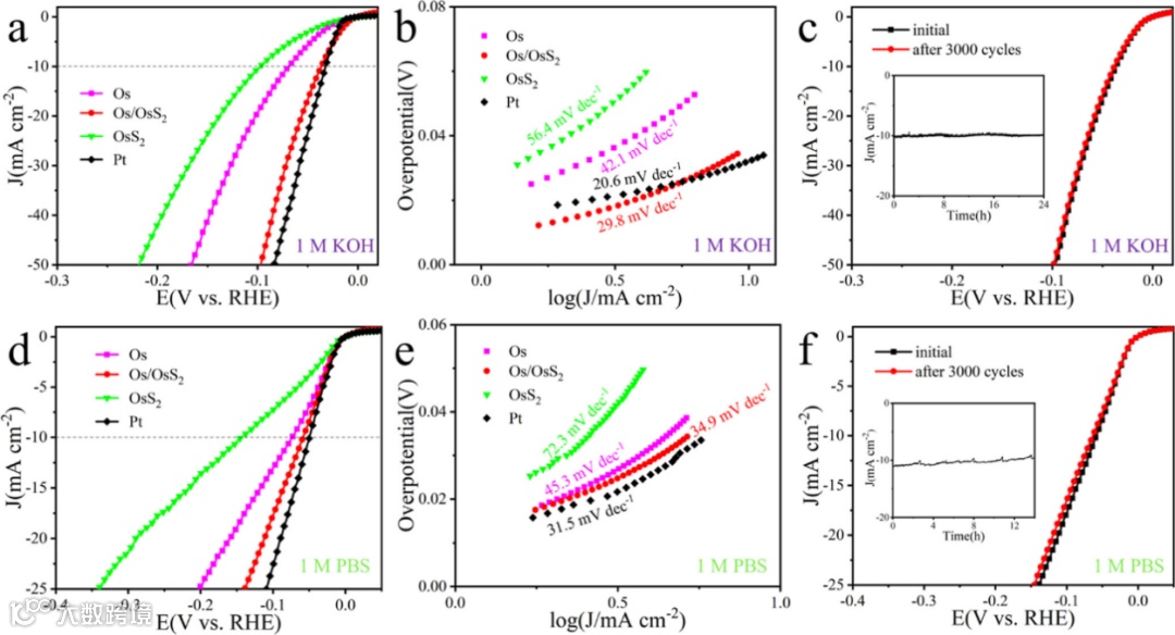 进一步调查了Os/OsS2催化剂在碱性及中性介质下的催化性能。结果表明,Os/OsS2催化剂在碱性及中性介质下均具有可与铂催化剂相媲美的催化活性,以及极佳的稳定性。因而,作为高效的析氢催化剂,以Os/OsS2异质结构为代表的Os基催化剂展示出广阔的应用前景。