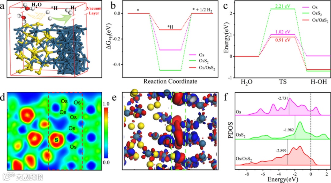图1. Os/OsS2异质界面析氢行为及电子结构的理论计算结果。