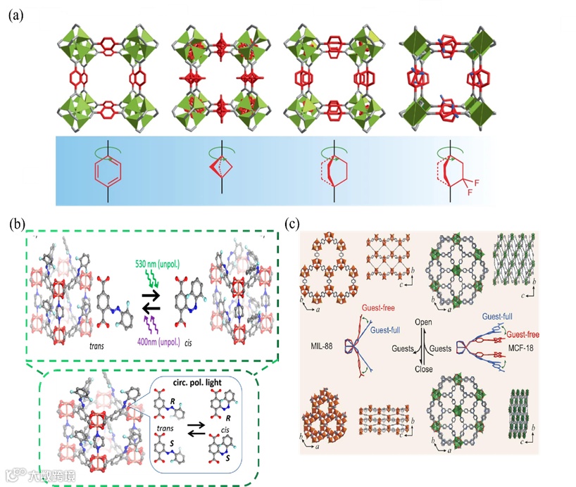 图2. 刺激响应MOF材料的设计策略: (a)分子转子,(b)分子开关,和(c)框架设计