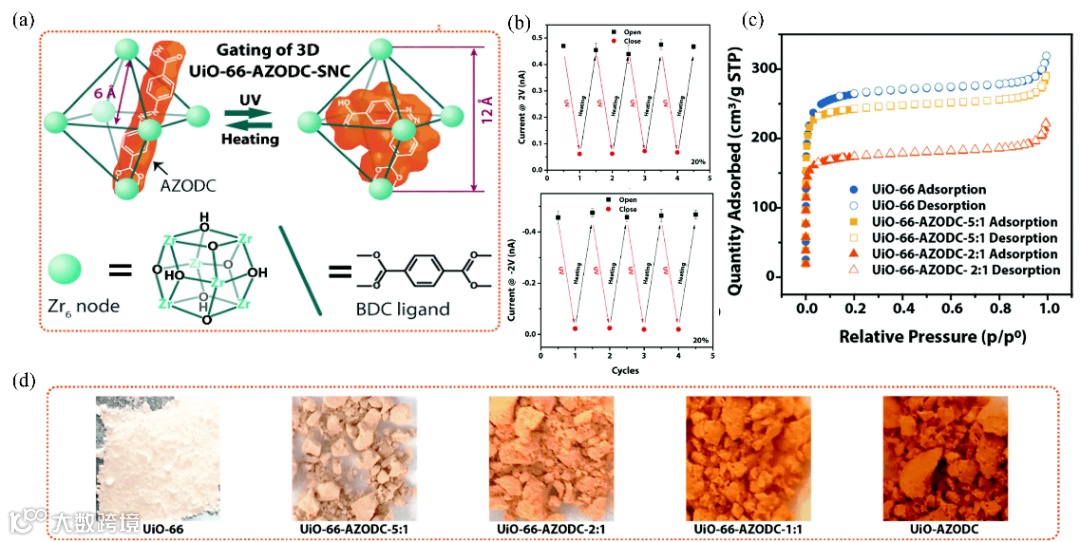 近年来,一系列能够接受环境刺激信号(如,光响应、温度响应、pH响应、压力响应、电响应和湿度响应)的MOF材料已被陆续设计和开发,这些刺激响应MOF材料往往可以通过加载具有能够接受不同刺激信号的响应分子来实现,这一特点为研究人员优化材料响应性能提供了足够的空间。常见的刺激响应分子,如光响应的偶氮苯、螺吡喃和二芳基乙烯,热响应的N-异丙基丙烯酰胺、甲基丙烯酸二甲氨基乙酯等,而其他材料的响应机理主要包括刺激响应MOF材料内两性物质的结构异构化、门控效应的开/关状态和官能团的质子化/脱质子化。